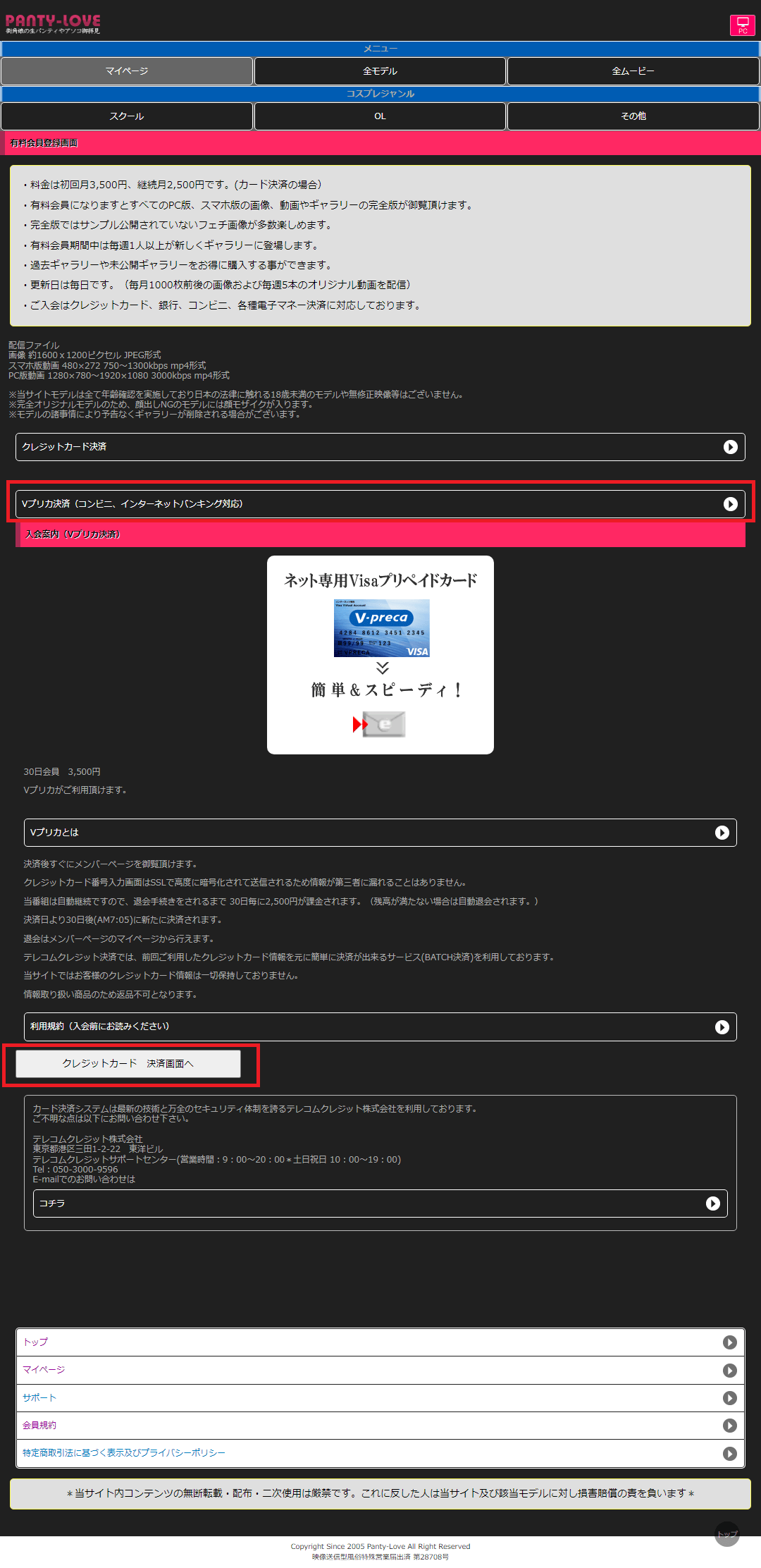 PANTY-LOVE(パンティラブ)に入会するには「クレジットカード払い」「Vプリカ決済(ネット専用Visaプリペイドカード)」の2種類の登録方法があります。どちらも初回のみ3500円、2ヶ月目以降は2500円という価格設定になっています。
