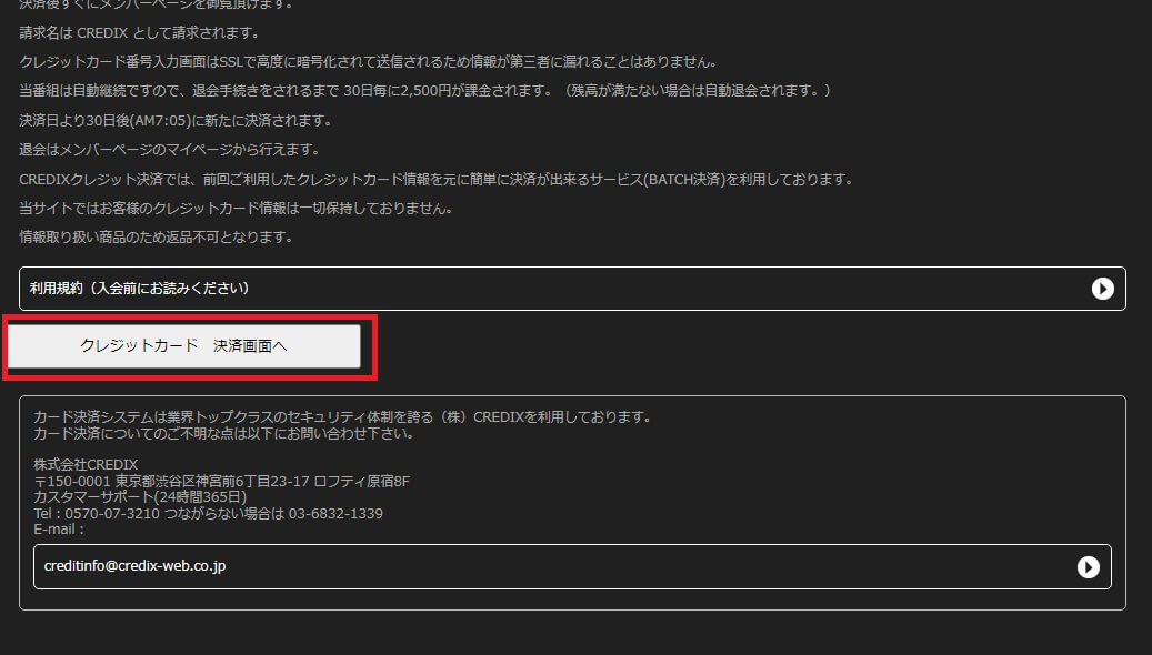ページが切り替わり下にスクロールし「クレジットカード決済」のボタンをクリックしてください。