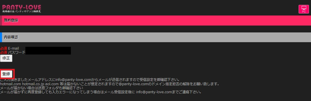 その場合、@panty-love.comのドメイン指定拒否の解除をする必要があります。それでもメールが届かない場合は迷惑フォルダを御確認下さい。メールが届かずに再度登録しても入力エラーになってしまう場合はメール受信設定後に info@panty-love.comまでご連絡しみて下さい。