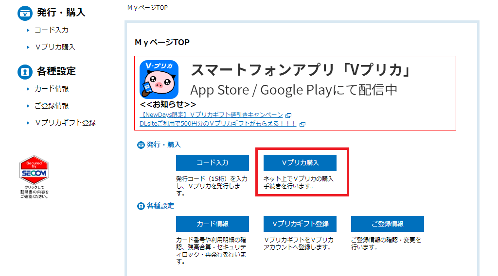 クレジットカードやインターネットバンキングをお持ちでない方でも、最寄りのコンビニエンスストア(大手3社+セイコーマート)でVプリカを購入することが可能です。購入時に受け取る発行コードを、Vプリカの会員専用ページ(Myページ)で入力するだけで、すぐにVプリカが発行されて使用できます。下記で購入手順をまとめていますのでご確認ください。