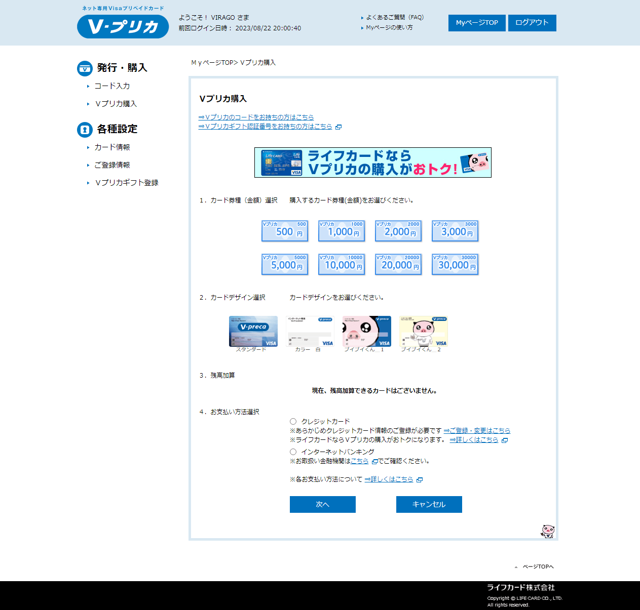 VプリカのMyページから申し込みをすれば、クレジットカードやインターネットバンキングを用いて支払いができます。支払いが完了後、MyページですぐににVプリカが生成され、利用可能となります。下記で購入手順をまとめていますのでご確認ください。